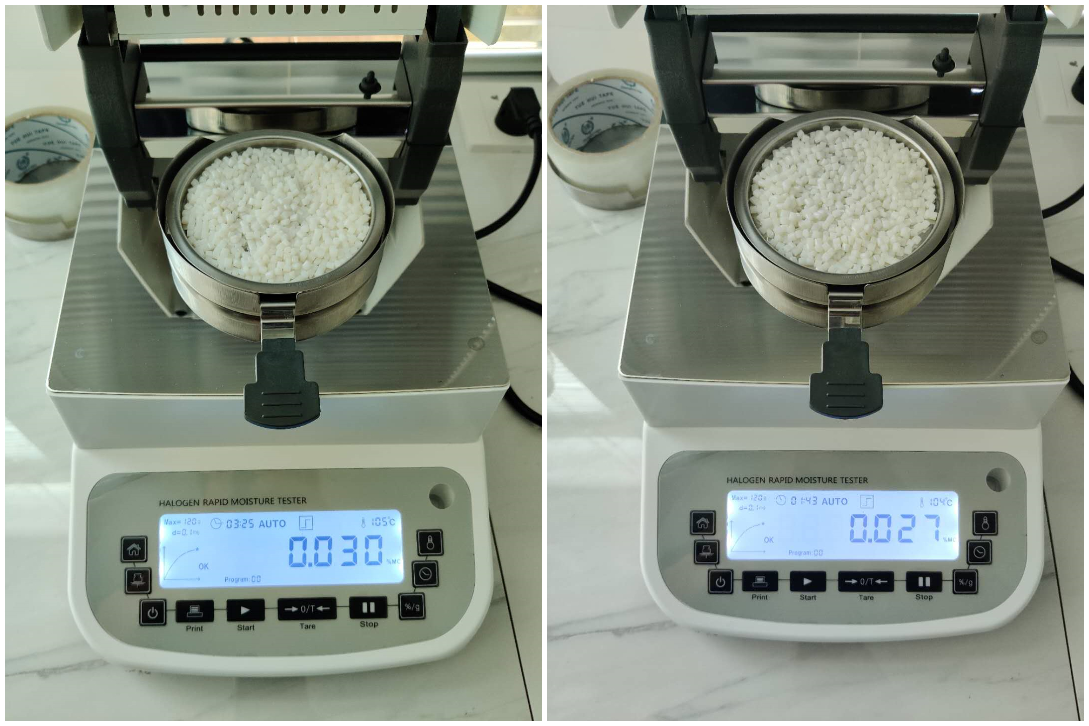 - 烘干后用實驗勺取15g左右烘干的塑料顆粒均勻鋪在樣品盤上,設(shè)置好合適的溫度后蓋下上蓋,按下“START”鍵開始測試;蜂鳴兩聲后,儀器自動停機,測試結(jié)束,可在液晶顯示屏查看測試后樹脂顆粒的水含量為0.030%;
