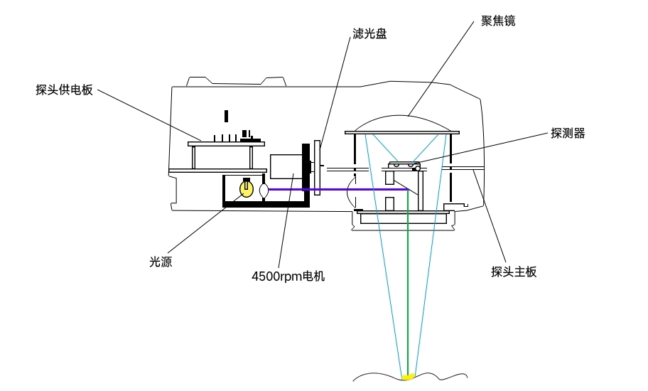 在線紅外水分測量儀使用裝嵌在轉輪上的精密紅外濾光片。這種安裝允許參照光和測量光的脈沖交替地通過濾光片。被保留的光束會被聚焦在受測試的樣品上。首先是參照光被投影在樣品上,然后是測量光被投影在樣品上。這兩個具有時序的光能脈沖會被反射回到一個探測器上,依次轉換成兩個電信號。參考通道表示預計的反射能量的多少。測量通道有一部分被水分子所吸收,因此其能量將出現衰減。這兩個信號結合形成一個比率。這比率與一些從不同含水程度樣品中獲得的其它比率的差,是與兩者含水量的差成正比例。
