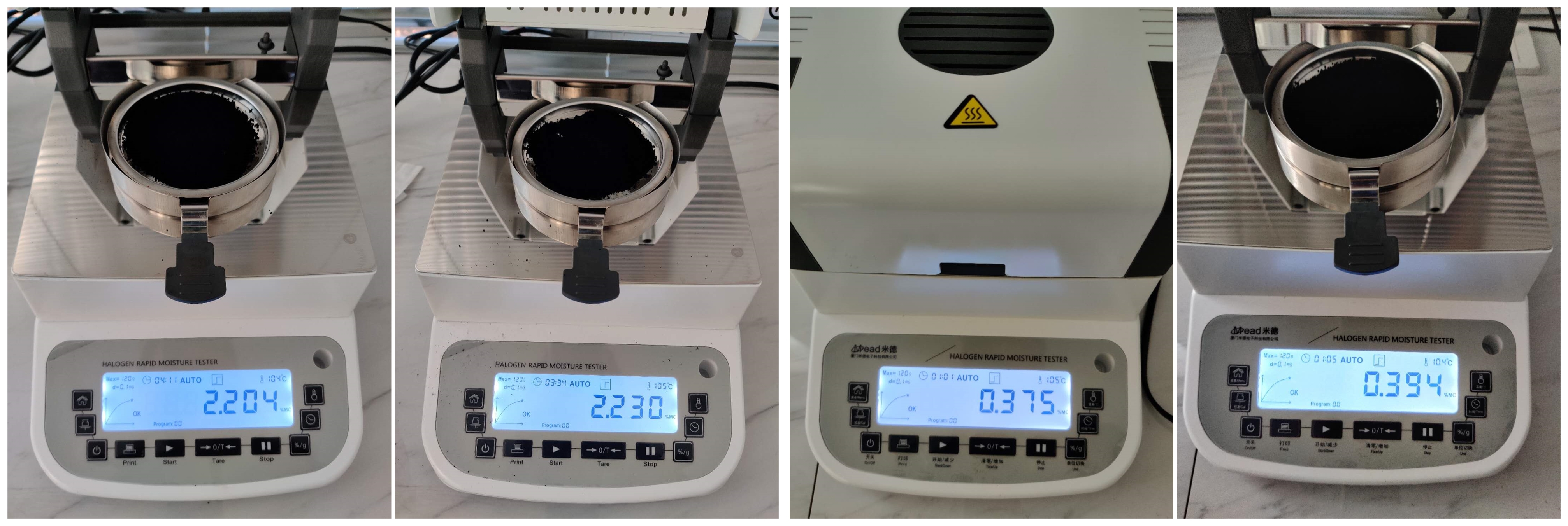 - 用樣品勺取適量充分暴露在空氣中的碳黑粉末均勻鋪在樣品盤上,設(shè)置好合適的溫度后蓋下上蓋,按下“START”鍵開始測試;蜂鳴兩聲后,儀器自動停機,測試結(jié)束,可在液晶顯示屏查看被測粉體的水分含量為2.204%;